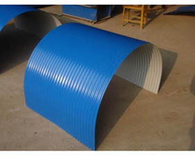 彩钢弧形盖板,彩钢瓦盖板,皮带机输送带盖板采用上海宝钢集彩钢板为原材料加工生产,表面颜色有海蓝/白灰/象牙白/淡红色/信号绿热。彩钢弧形盖板,彩钢瓦盖板,皮带机输送带盖板厚度为0.5/0.6/0.7/0.8。